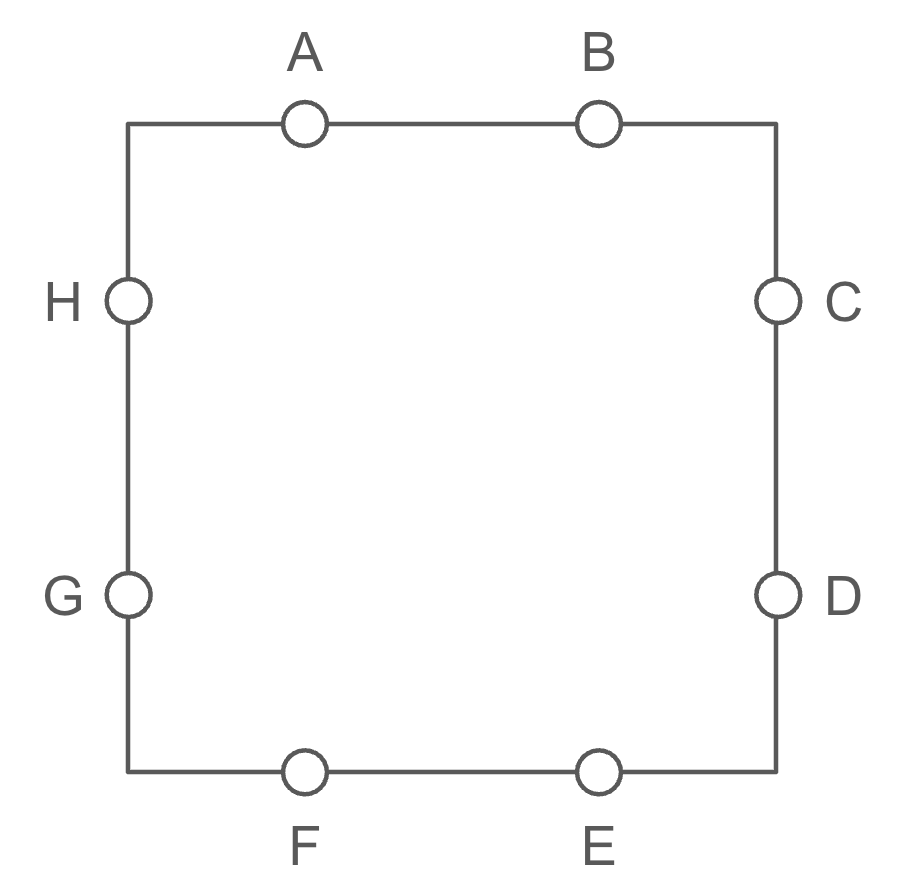Consider the following diagram, which consists of eight points (labeled A through H), two on each side of the square. A valid “letter boxed” sequence starts at any of the eight points, and proceeds through all of the other points exactly once. However, adjacent points in the sequence can never be on the same side of the square. The first and last points in the sequence can be on the same side, but do not have to be.