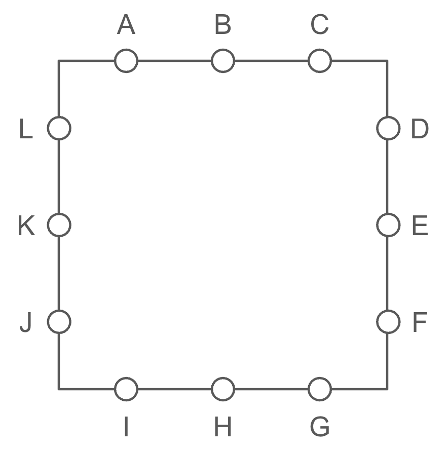 Instead of two points on each side of the square (and eight points in total), now there are three points on each side (and twelve points in total), labeled A through L in the diagram below.