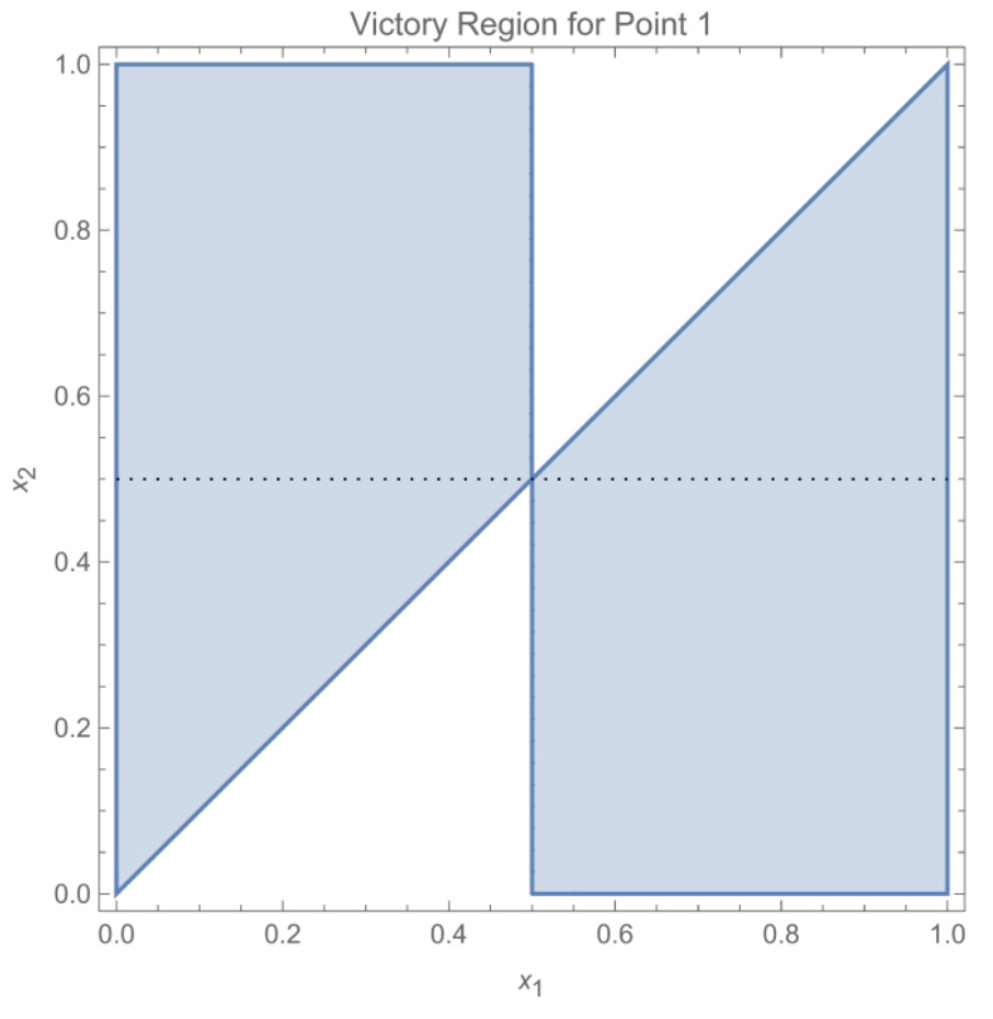 First, let’s analyze your chances of correctly comparing x2 to x1. Since x1 and x2 were both uniformly distributed between 0 and 1, you could represent all possible pairs of them as points in the unit square whose x-coordinates represented x1 and whose y-coordinates represented x2. When x1 was between 0 and 0.5, you guessed “high” and won the round as long as x2 was actually greater than x1. And when x1 was between 0.5 and 1, you guessed “low” and won the round as long as x2 was actually less than x1. The diagram below, courtesy of solver Michael Schubmehl, shows these winning regions in the unit square.