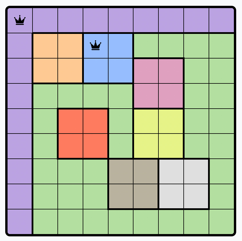 Apparently they do. One of them, Queens, feels like the offspring of chess and sudoku. (It’s essentially Star Battle … with a color scheme?) On a square grid, your goal is to have exactly one queen in each row, column, and color region. Two queens cannot touch each other, not even diagonally.