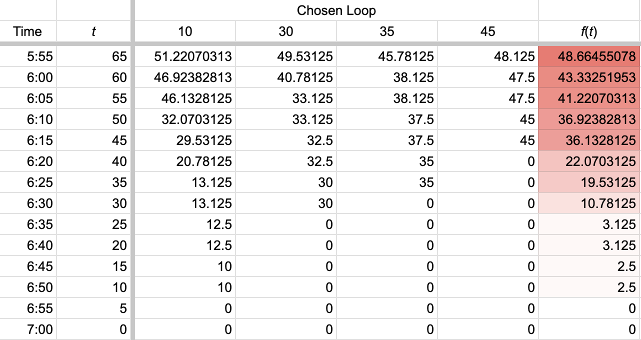 Next, let’s jump back to 6:55. (Five-minute intervals made sense here because all the times and loop durations were multiples of five.) If you had just finished a loop at 6:55, how many more minutes could you expect to run? Since all four loops required more than 5 minutes, you couldn’t have completed any of them. That still meant you could expect zero more minutes worth of completed loops.