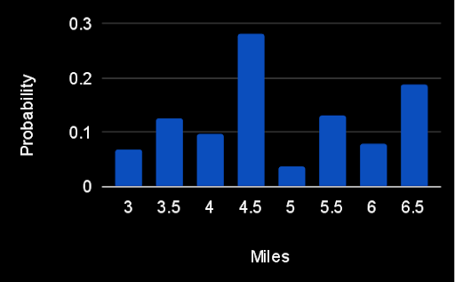 Solver 🎬 Tom Singer 🎬 produced a distribution of how many miles you’d complete in the 65 minutes you had: